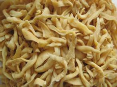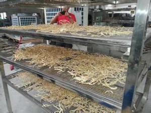 脱水蔬菜是经过人工加热脱去青鲜菜中大部分水后,而制成的一种干菜。食用时不单味美、色鲜,而且能保持原有的营养价值;再加上它比鲜菜体积小、重量轻、入水便会复原、运输食用方便等,而备受人们的青睐。 选料:豆角、黄瓜、芹菜、青辣椒、蒜苔、萝卜、生姜、青刀豆、马铃薯、胡萝卜、洋葱、竹笋、黄花菜、食用菌等肉质肥厚、组织致密、粗纤维少的新鲜饱满蔬菜,都可以用来加工脱水蔬菜。烘干时,将煮烫晾好的蔬菜均匀地摊放在烘盘里,然后放在事先设好的烘架上,温度控制在32℃—42℃,让其干燥,每隔30分钟进入烘房检查温度,同时不断翻动烘盘里的蔬菜,使之加快干燥速度,一般经过11—16小时。
