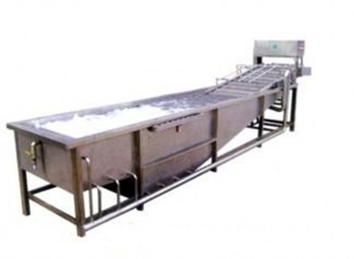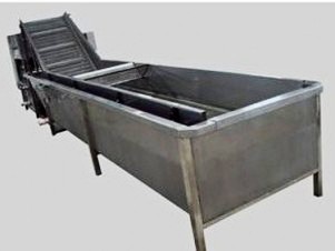 清洗机由水箱、提升机、循环冲洗水泵、传动部分等部件组成,工作时由于水中压力的存在,使果蔬在水中剧烈翻滚搅动,清洗水经过过滤后,由循环冲洗泵加压至进料口喷管回冲,喷管方向可调,物料被喷管喷出的高压水再次冲洗,并朝着出口方向漂移,出口处置刮板提升机,刮板提升机的速度可调(调节刮板提升机速度到所需的生产能力),将冲来的果蔬送至下道,工序(可根据用户要求在出口刮板提升机上加喷淋管,进一步进行喷洗)。也可根据用户不同的物料,加工不同的提升结构。