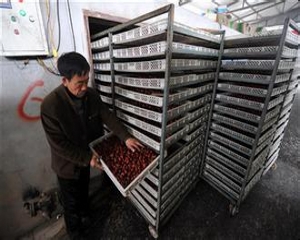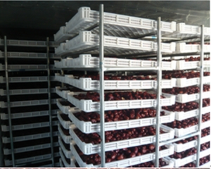5、装枣:每平方米烘盘装枣量,因不同品种而异。一般为7.5公斤左右,装枣厚度以2层为宜。小果品种如金丝小枣可适当增大装枣量。